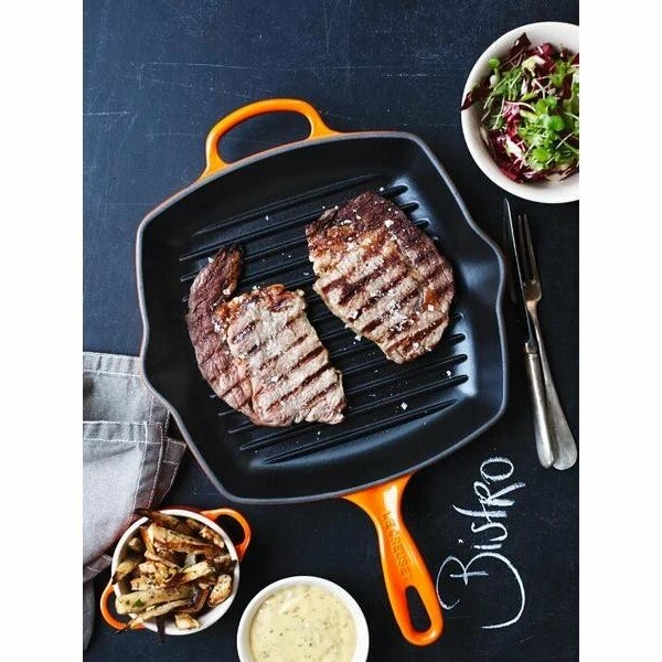 Mit der Grillpfanne Signature von Le Creuset servieren Sie Ihrer Familie würzig marinierte Putensteaks oder Zucchini und Pilze mit brauner Kruste direkt wie vom Grill. Die typischen Grilllinien werden beim Anbraten in die Lebensmittel eingeprägt, während das Fett sich in den Prägelinien sammelt. So bleiben die wichtigen Aromen und Fleischsäfte erhalten.