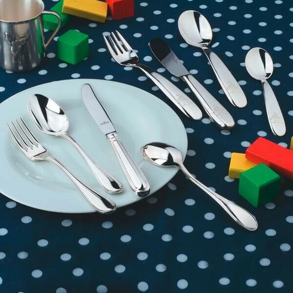 Das 4-teilige Kinderbesteck lässt sich durch die abgerundeten Griffe gut halten. So hilft es dabei, den Umgang mit Messer, Gabel und Löffel zu lernen. Optisch steht es dem Besteck der Erwachsenen jedoch in nichts nach. Die klassische Linie des Designs Schwedisch Faden harmoniert perfekt mit weißem Geschirr. Mit seinem polierten Glanz verlockt das Kinderbesteck dazu, am Tisch selbständiger zu werden. Das Besteck aus 925er Sterlingsilber präsentiert sich edel und zugleich sehr beständig und kindertauglich.